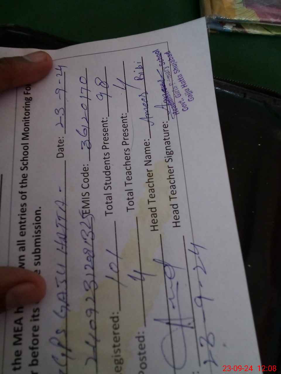 | Attendance Register | Head Teacher | MEA with School | Visit Proof |
