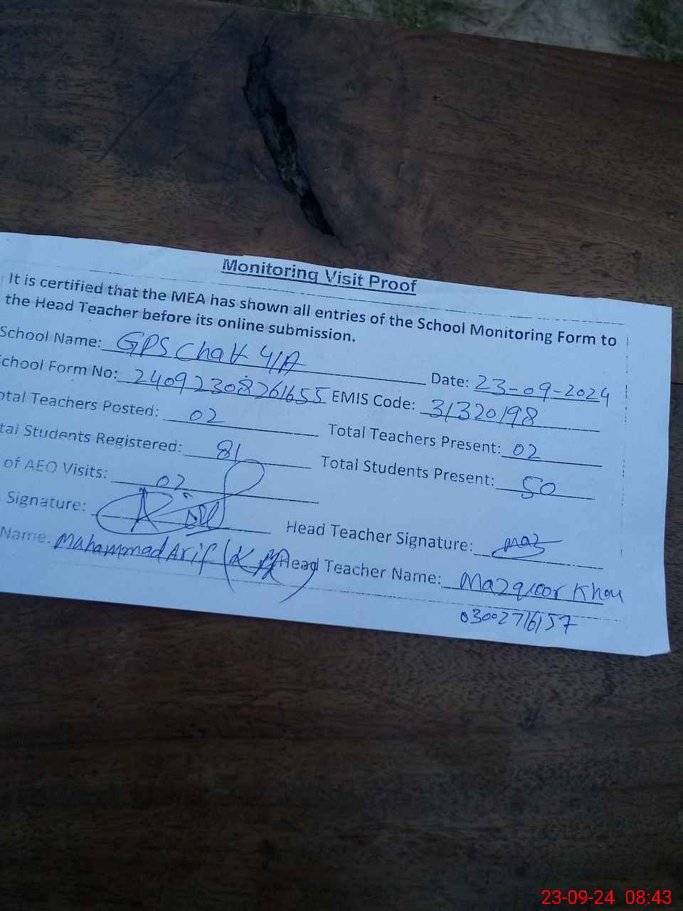 | EMIS Code: 31320198 | Name of School: GPS CHAK 4/A | |||