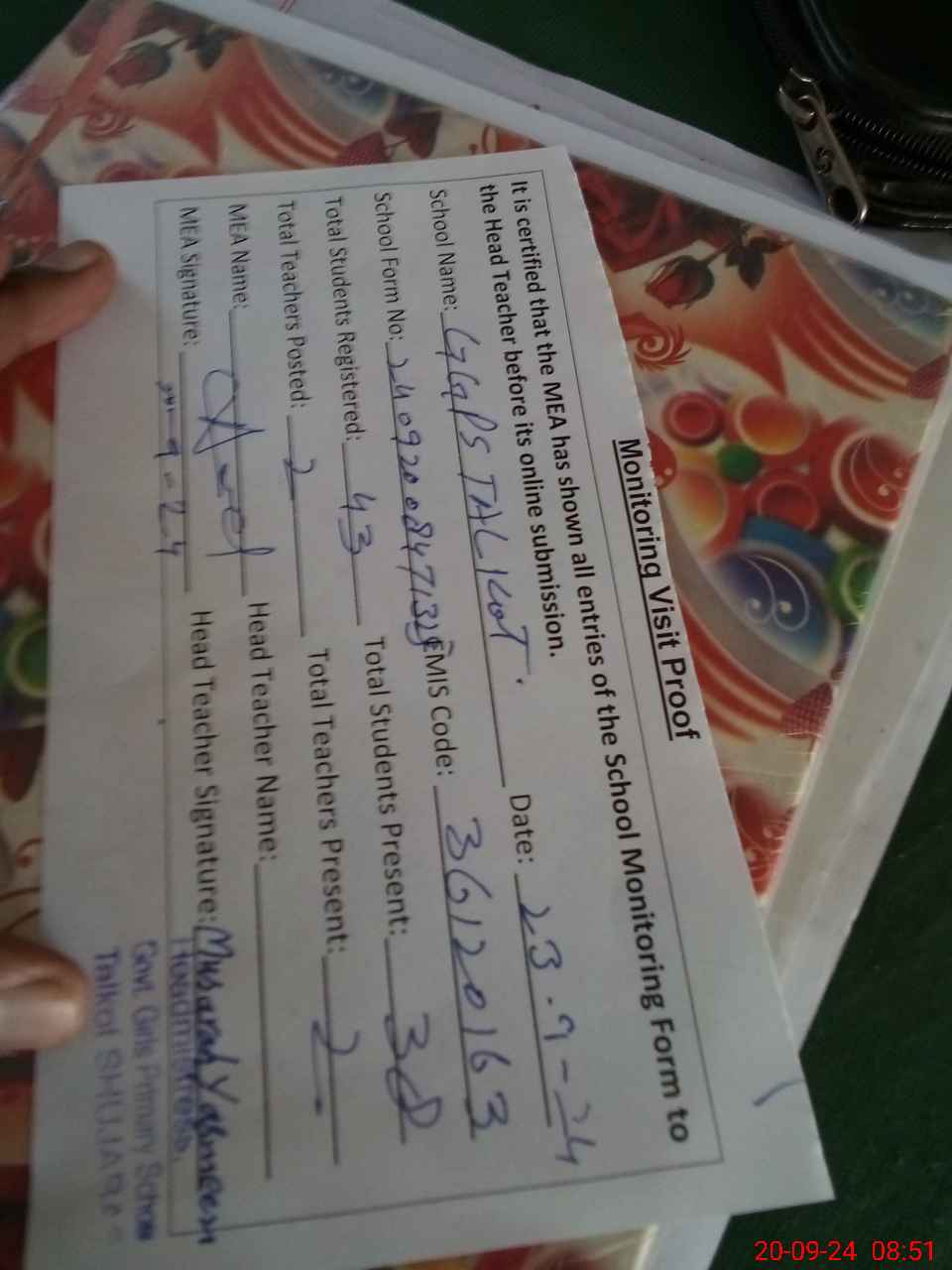 | Attendance Register | Head Teacher | MEA with School | Visit Proof |