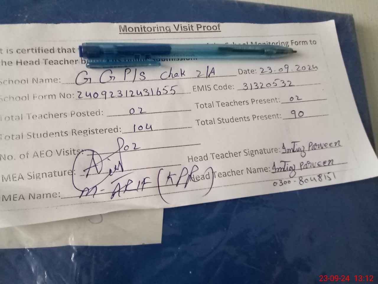 | EMIS Code: 31320532 | Name of School: GGPS CHAK NO.2/A | |||
