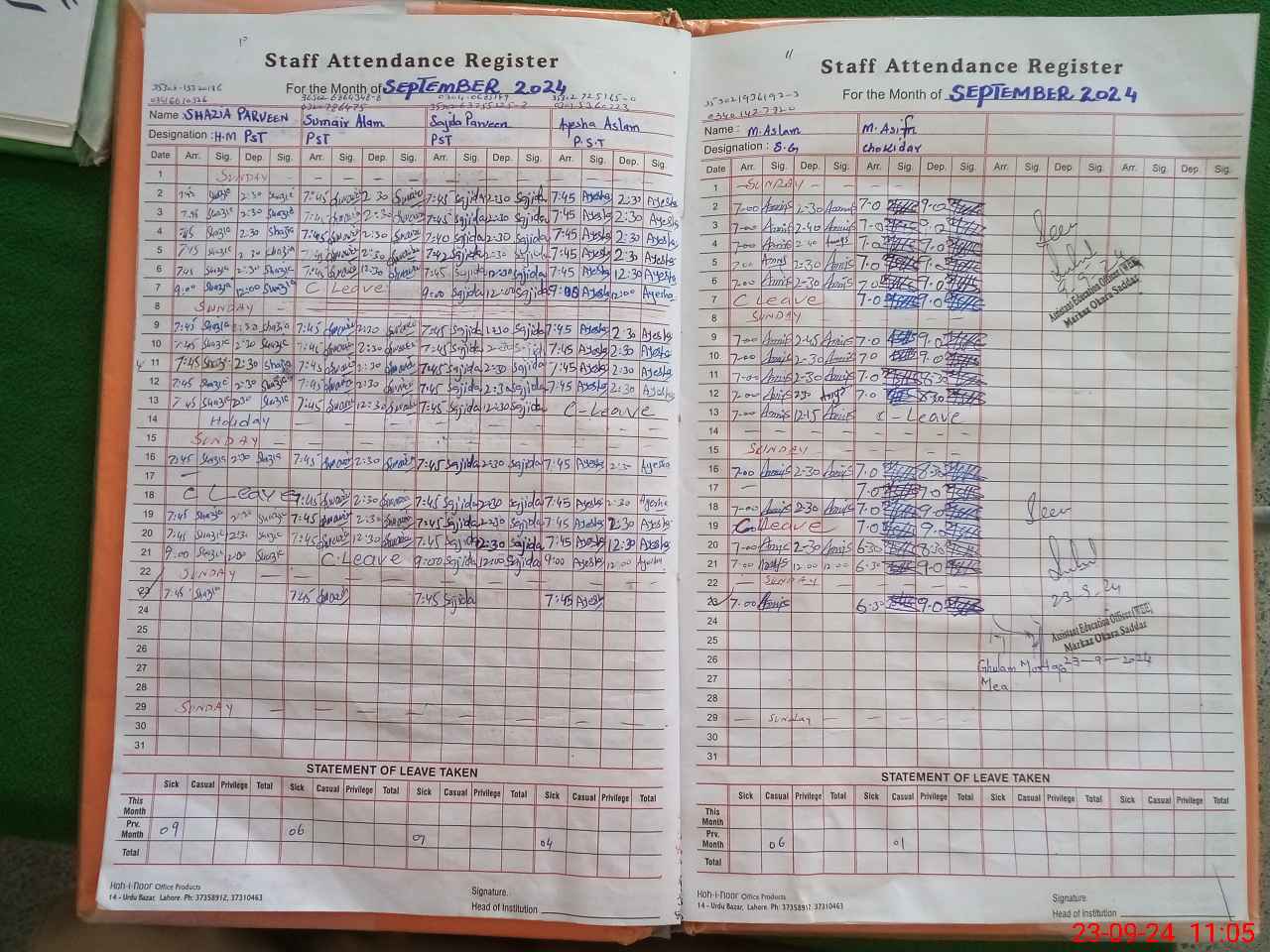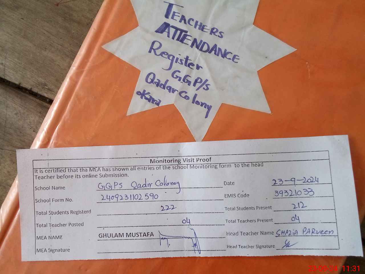 | Attendance Register | Head Teacher | MEA with School | Visit Proof |