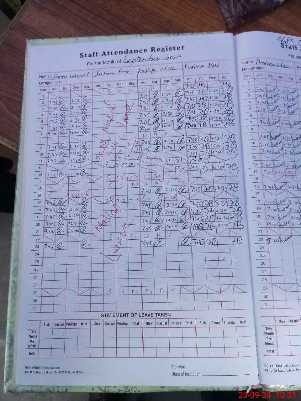 | Leave | Duty | Absent | Maternity | Medical | Ex- Pak |