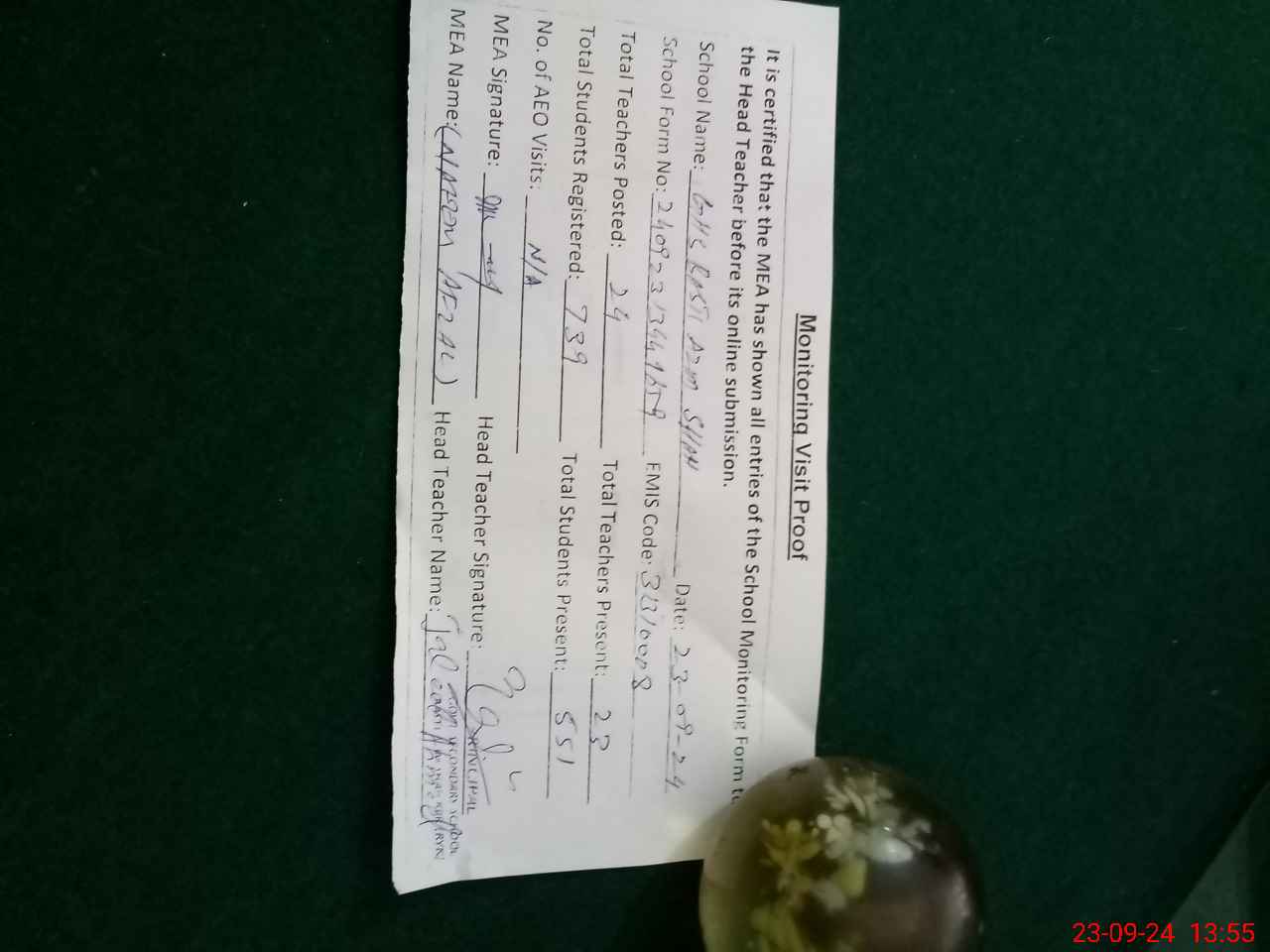 | Attendance Register | Head Teacher | MEA with School | Visit Proof |