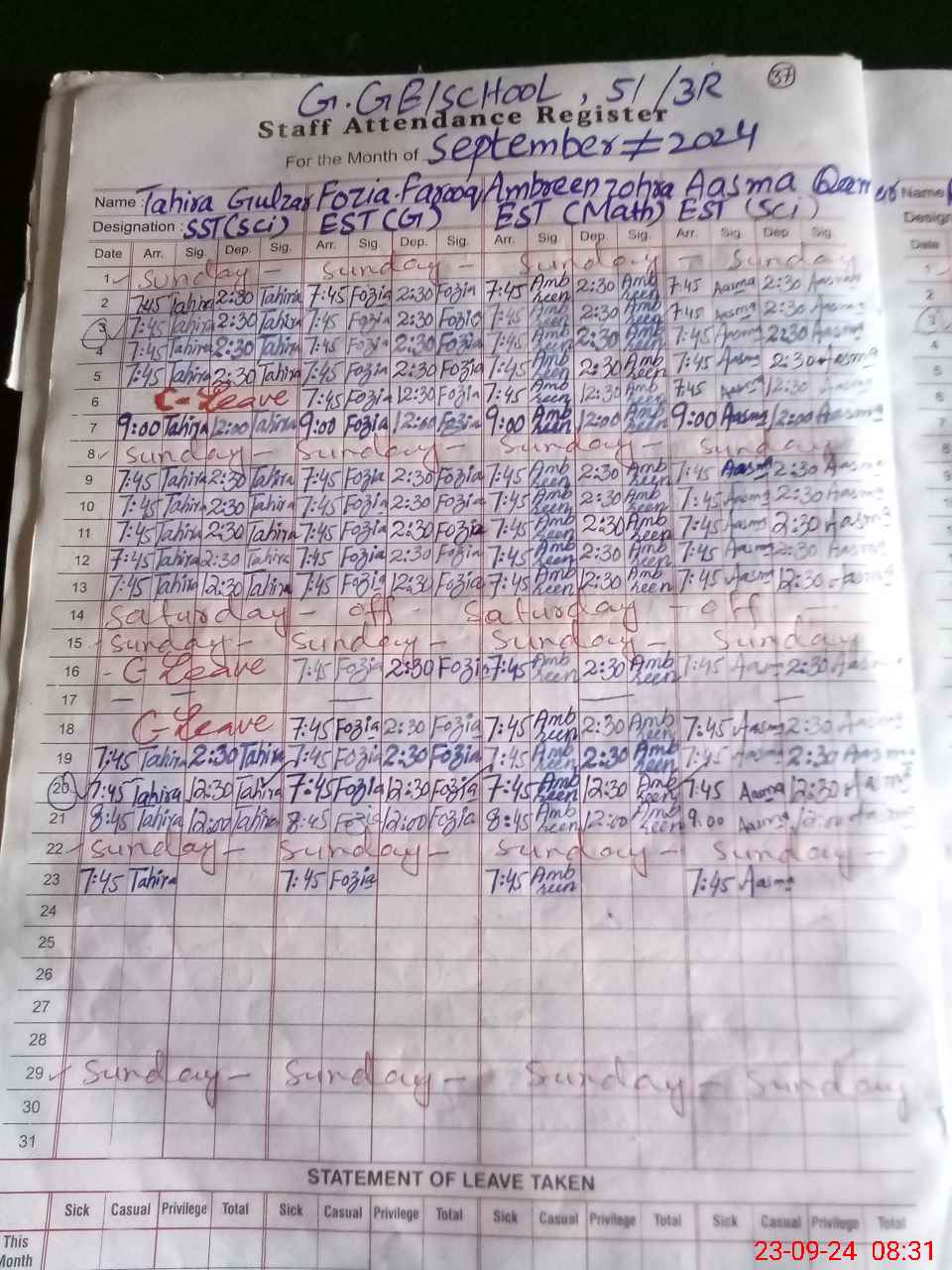 | Leave | Duty | Absent | Maternity | Medical | Ex- Pak |