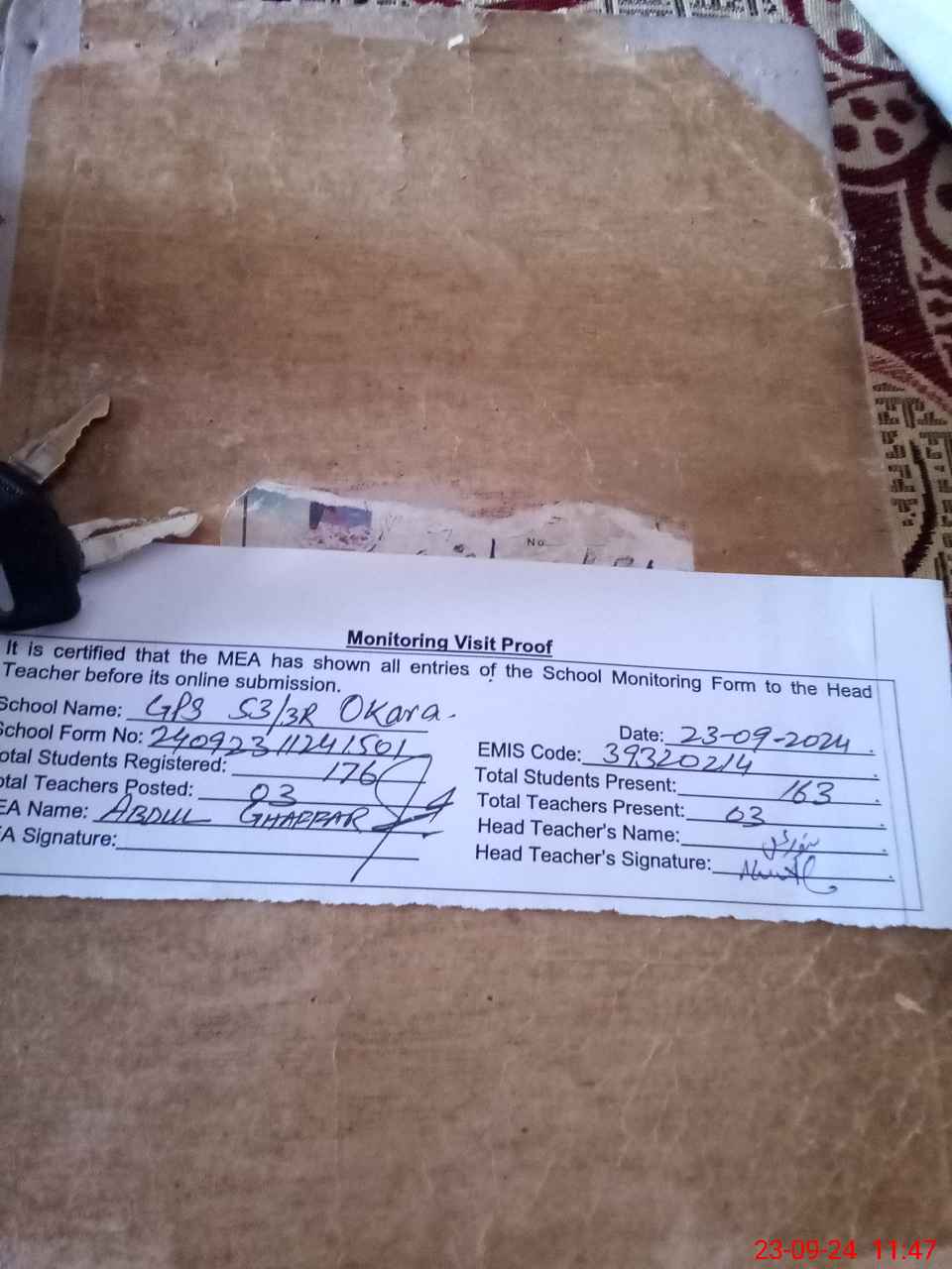 | Attendance Register | Head Teacher | MEA with School | Visit Proof |