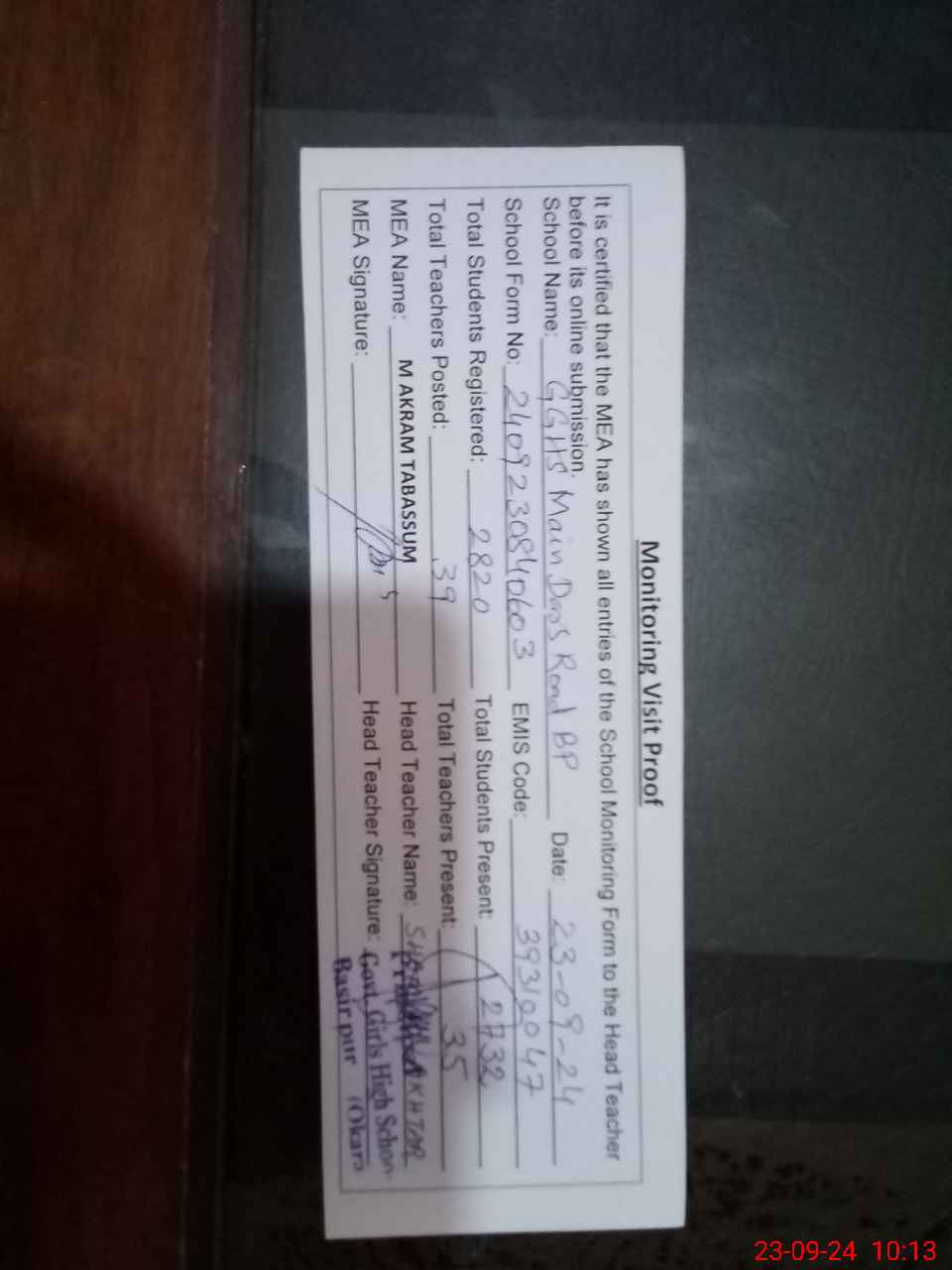 | Attendance Register | Head Teacher | MEA with School | Visit Proof |