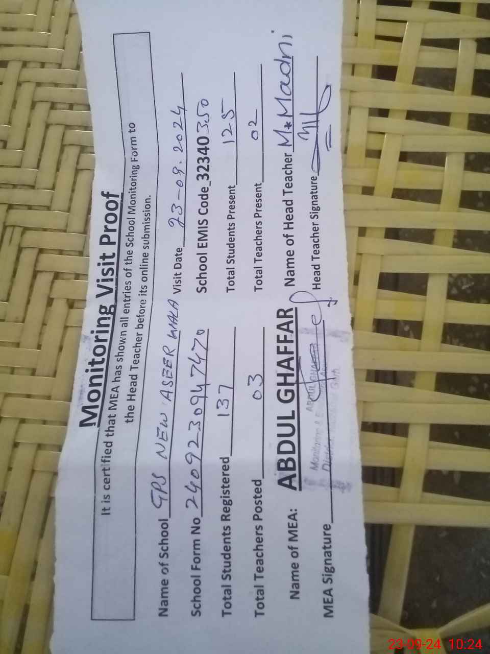 | Attendance Register | Head Teacher | MEA with School | Visit Proof |