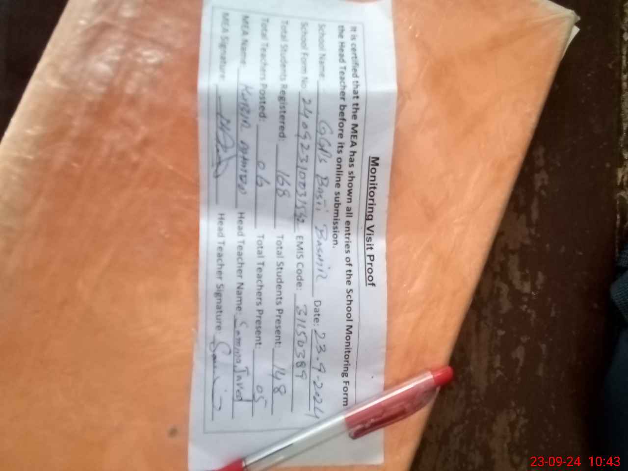 | Attendance Register | Head Teacher | MEA with School | Visit Proof |