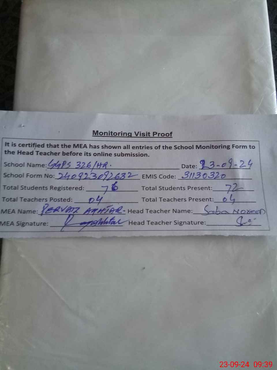 | Attendance Register | Head Teacher | MEA with School | Visit Proof |