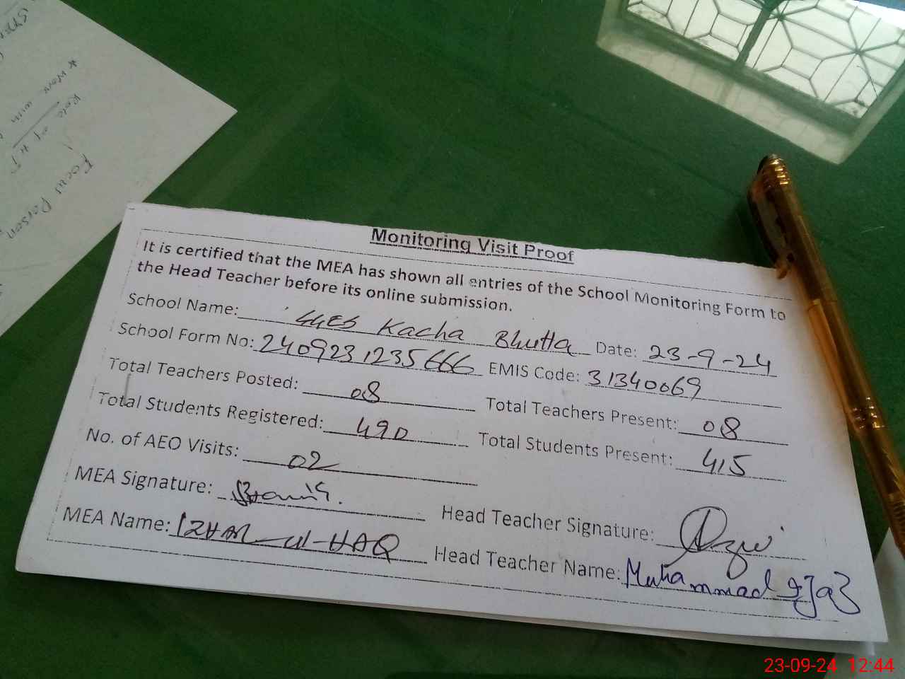 | Attendance Register | Head Teacher | MEA with School | Visit Proof |