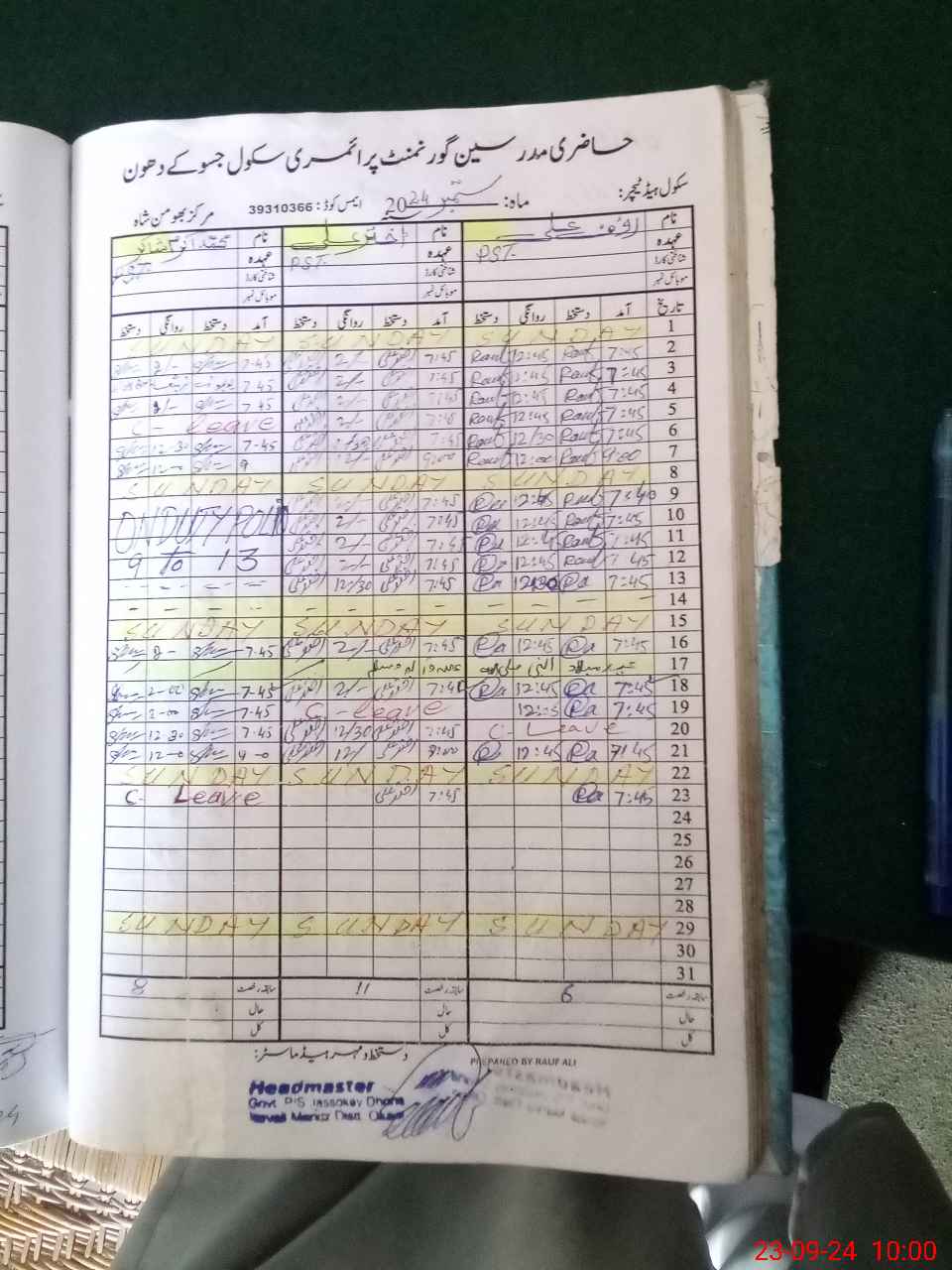 | Name: RA**** AL**** Designation: (School Headmaster's/Headmistress's) PST Phone/Cell Number: 03**** |