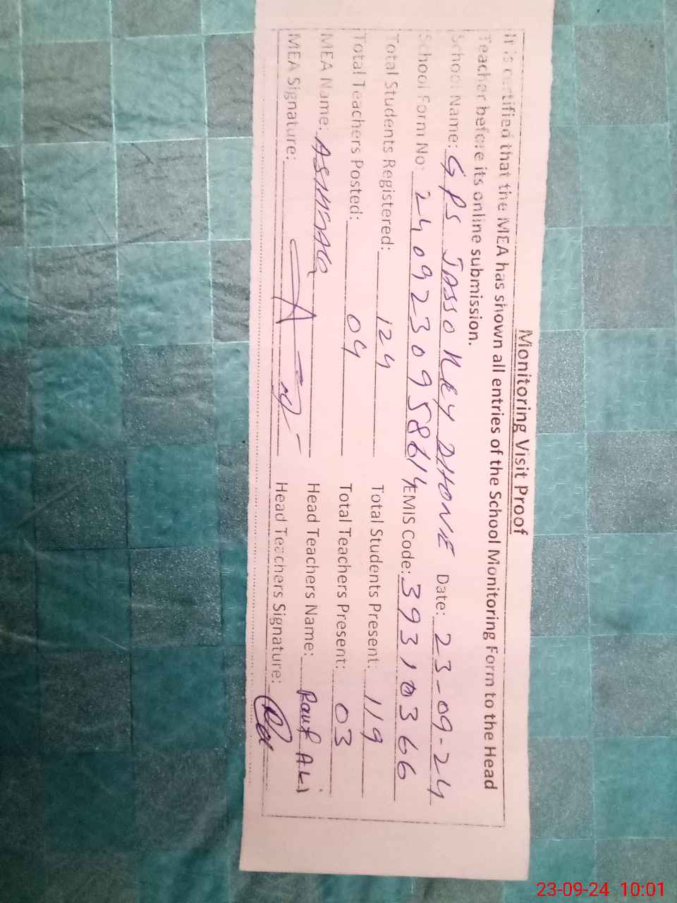 | Attendance Register | Head Teacher | MEA with School | Visit Proof |