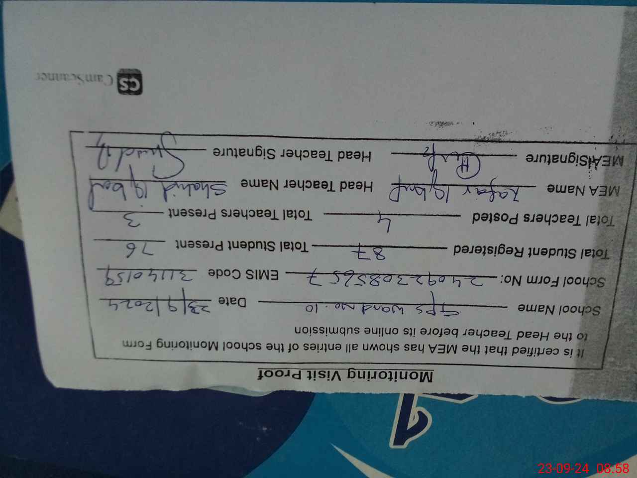 | Attendance Register | Head Teacher | MEA with School | Visit Proof |