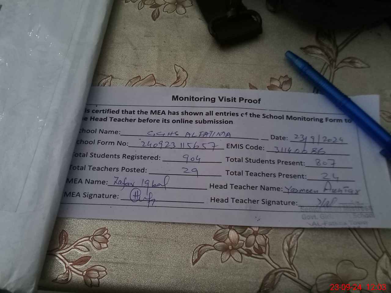 | Attendance Register | Head Teacher | MEA with School | Visit Proof |