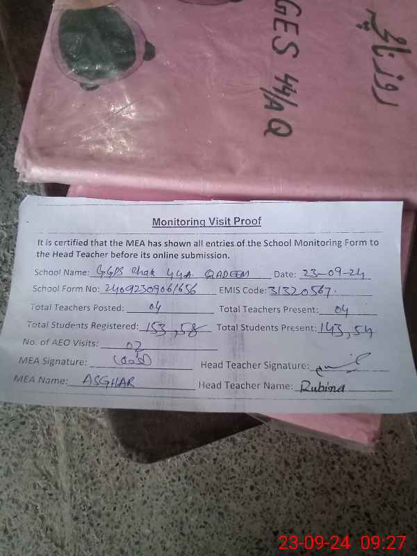 | EMIS Code: 31320567 | Name of School: GGPS CHAK 44/A QADEEM | |||