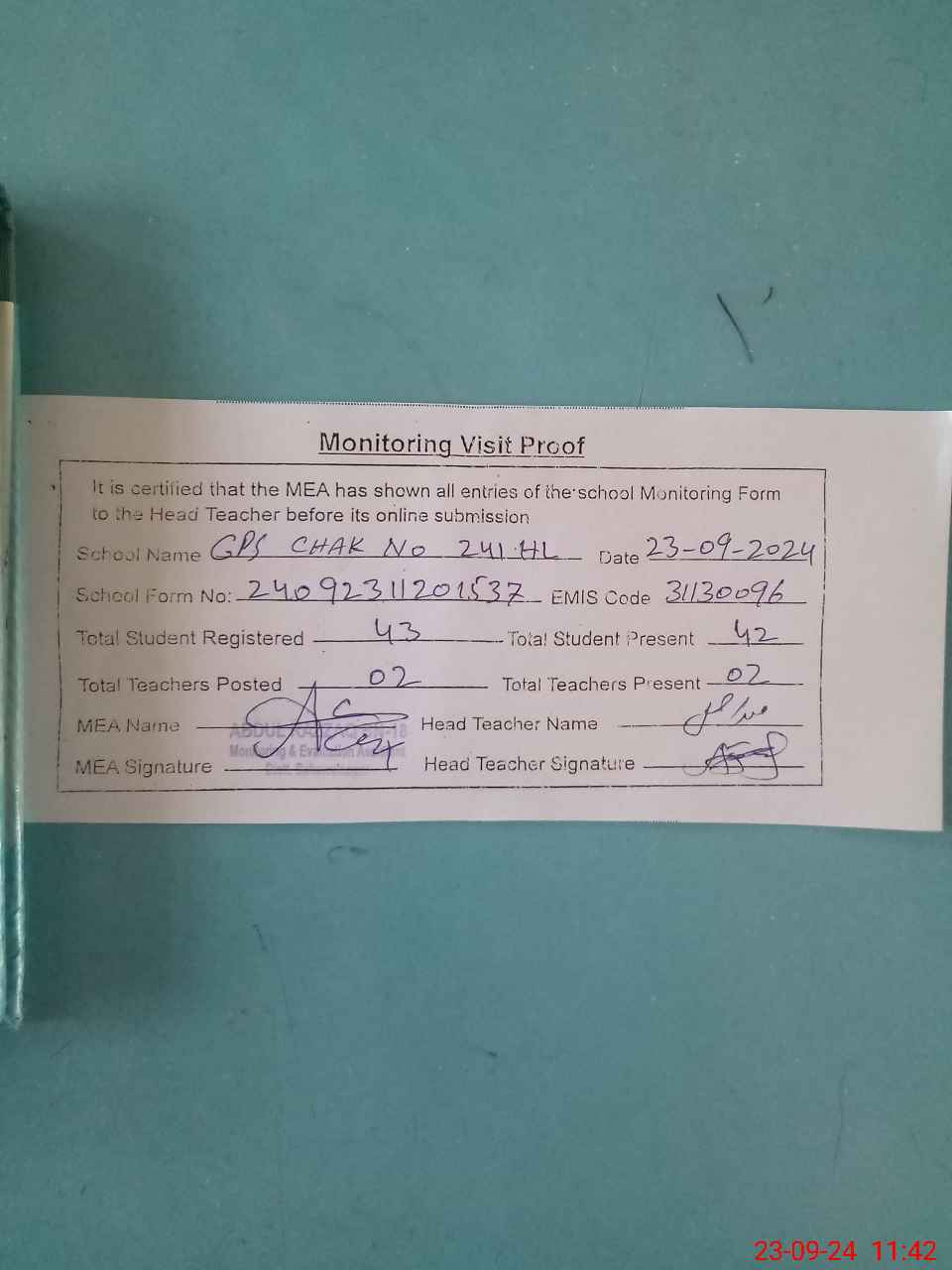 | Attendance Register | Head Teacher | MEA with School | Visit Proof |