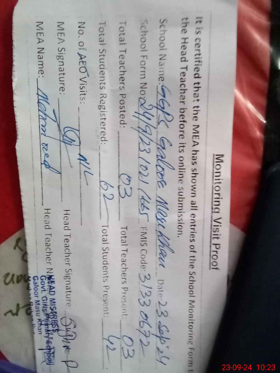 | Attendance Register | Head Teacher | MEA with School | Visit Proof |