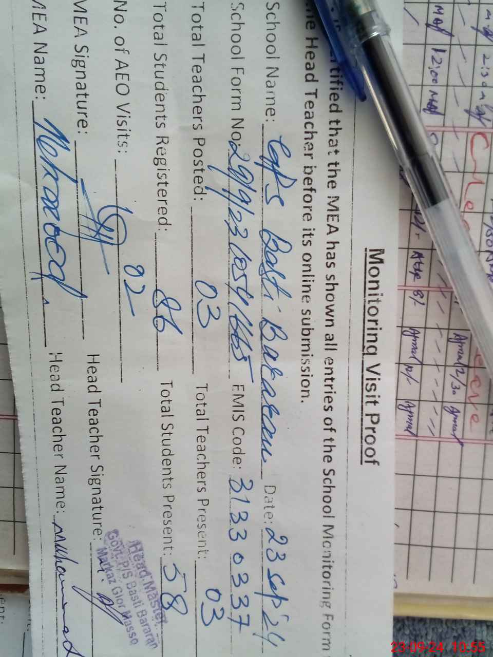 | Attendance Register | Head Teacher | MEA with School | Visit Proof |