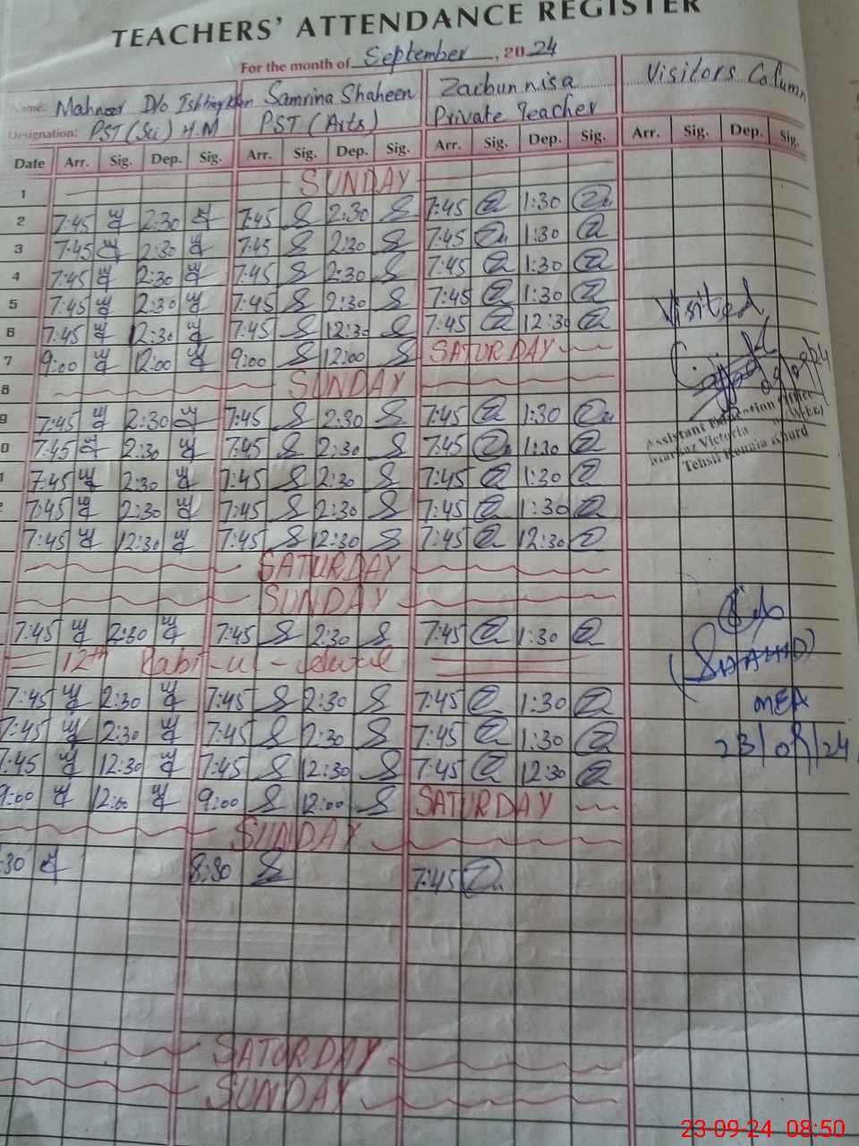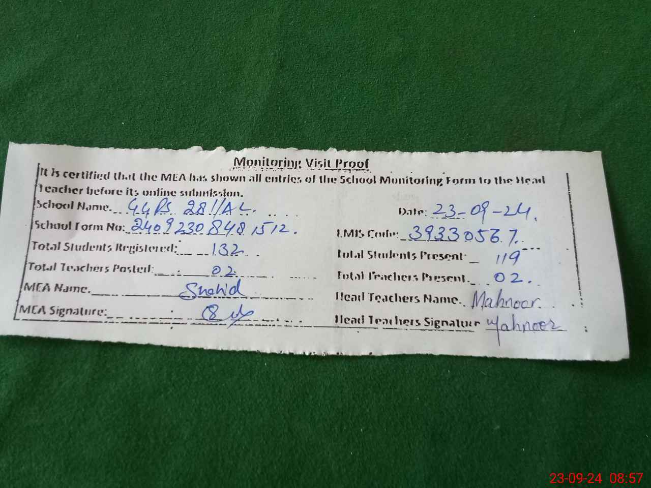 | Attendance Register | Head Teacher | MEA with School | Visit Proof |