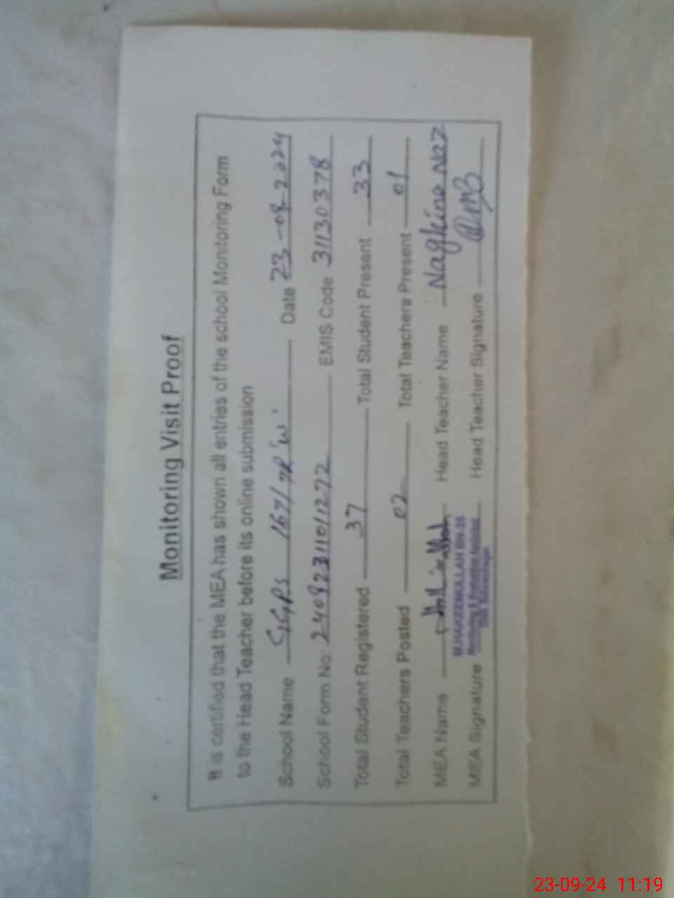 | Attendance Register | Head Teacher | MEA with School | Visit Proof |