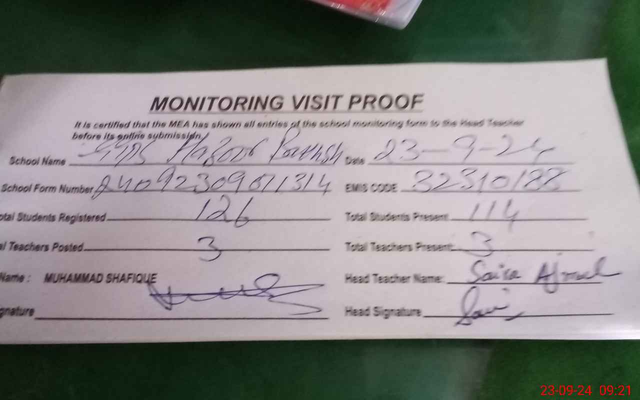| EMIS Code: 32310188 | Name of School: GGPS HAZOOR BAKHSH | |||