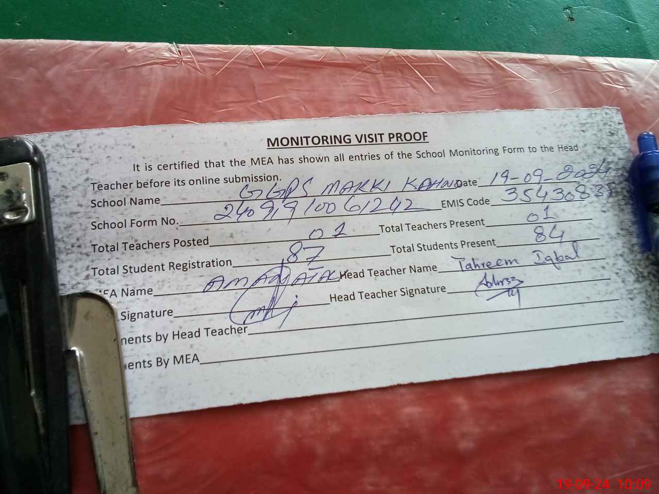 | Attendance Register | Head Teacher | MEA with School | Visit Proof |