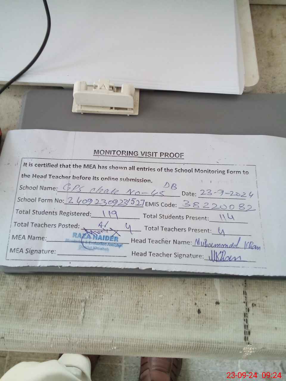 | EMIS Code: 38220082 | Name of School: GPS CHAK NO. 45/DB | |||