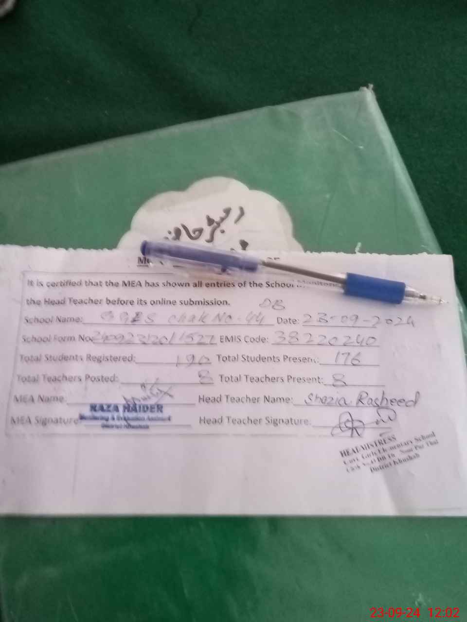 | Attendance Register | Head Teacher | MEA with School | Visit Proof |