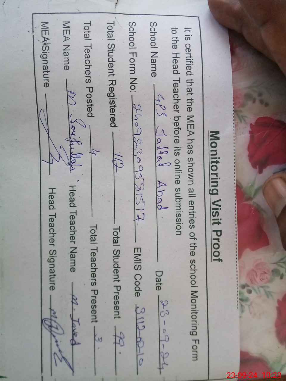 | Attendance Register | Head Teacher | MEA with School | Visit Proof |