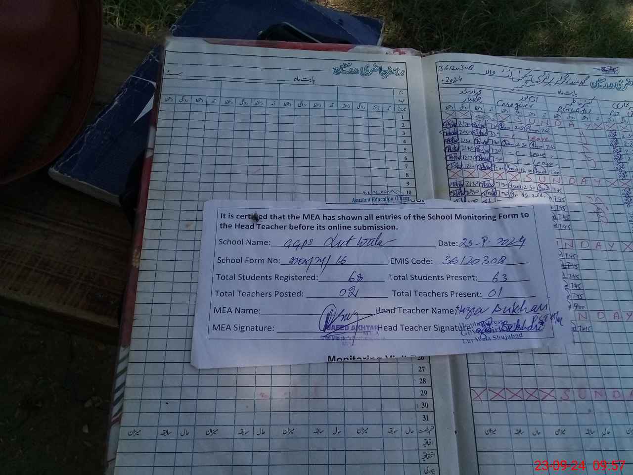 | Attendance Register | Head Teacher | MEA with School | Visit Proof |