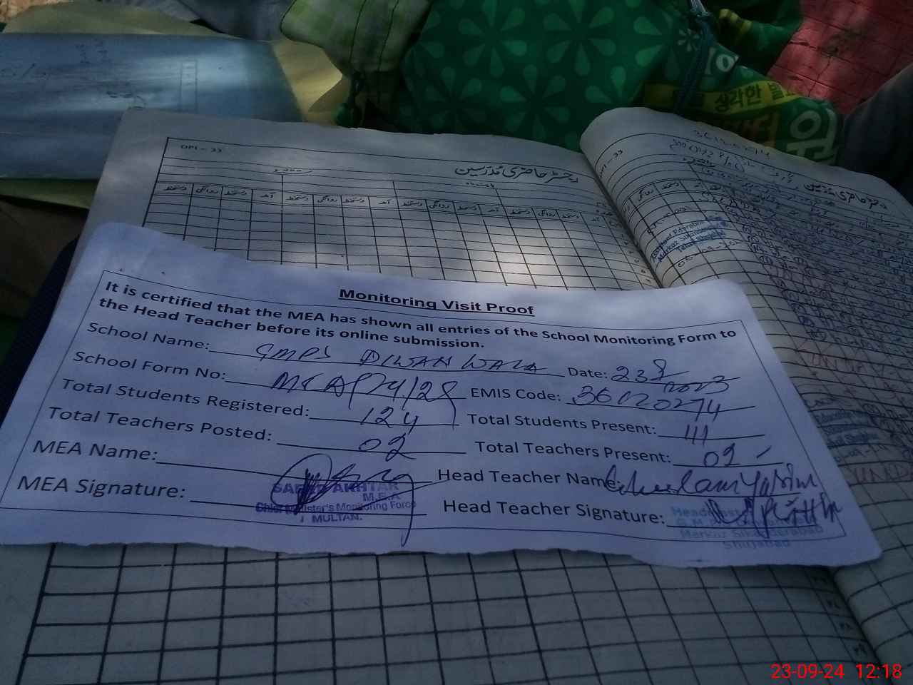 | Attendance Register | Head Teacher | MEA with School | Visit Proof |