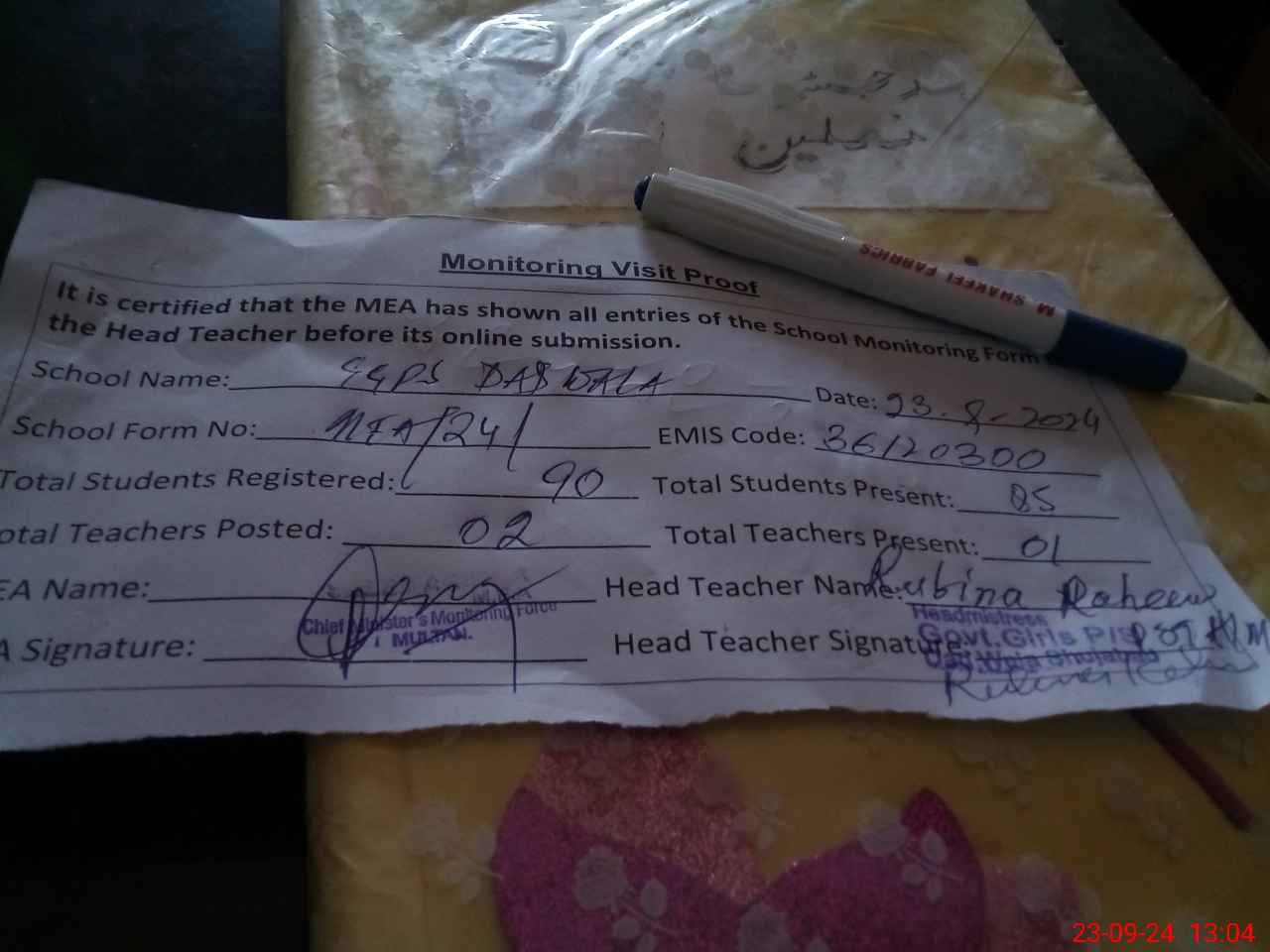 | Attendance Register | Head Teacher | MEA with School | Visit Proof |