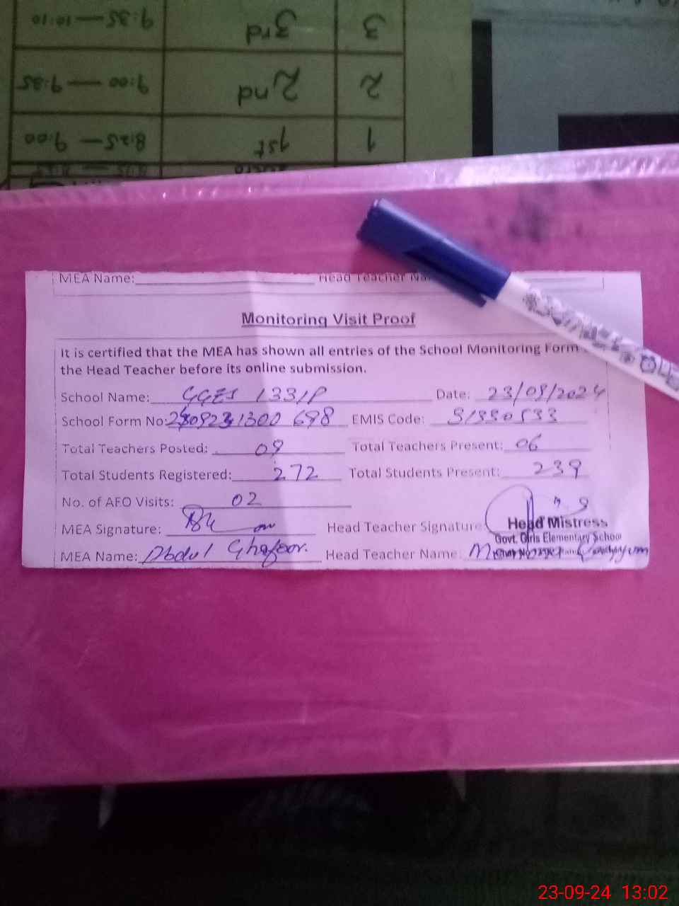 | Certified that this School was Inspected by the Undersigned MEA/DMO Today and the Information Stated Above is as Per Record. | |||||