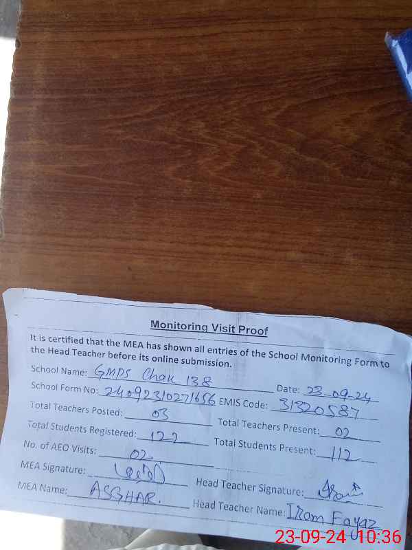 | EMIS Code: 31320587 | Name of School: GMPS CHAK NO.138/A | |||
