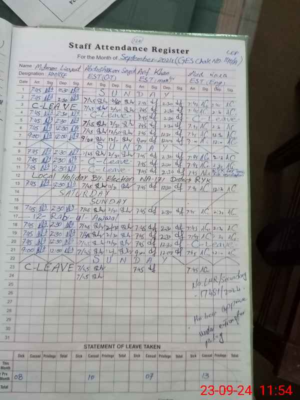 | CNIC | Full Name | Designation | R/C | Absence During Last Calender Month |