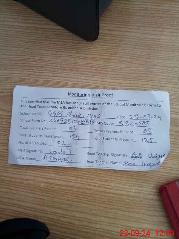 | Attendance Register | Head Teacher | MEA with School | Visit Proof |
