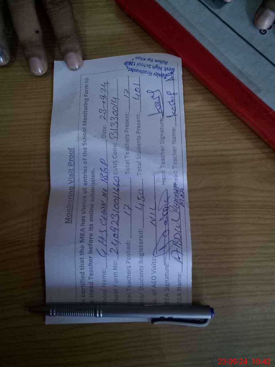 | Attendance Register | Head Teacher | MEA with School | Visit Proof |