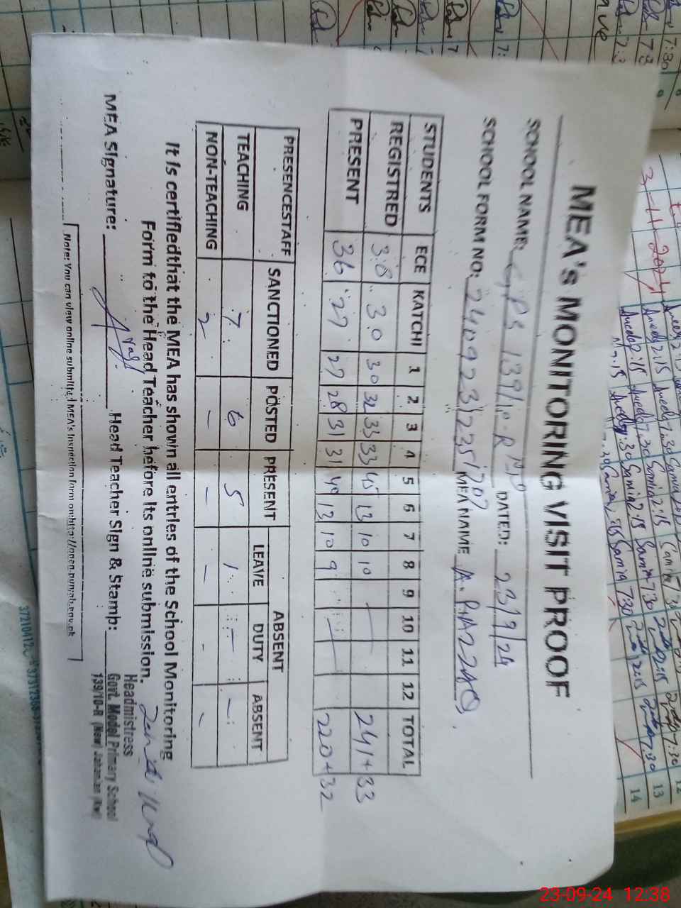 | Attendance Register | Head Teacher | MEA with School | Visit Proof |