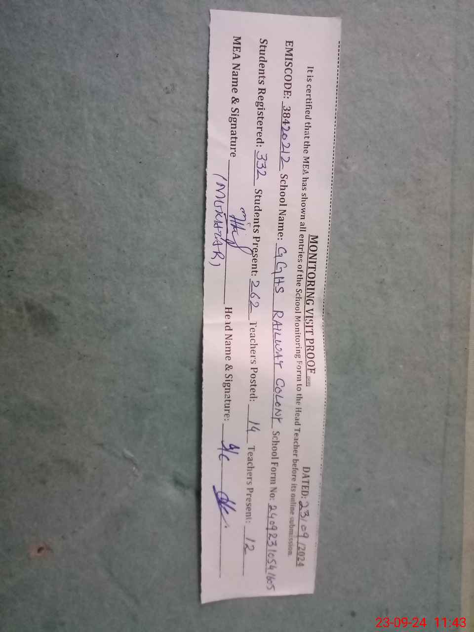 | Monitoring Date: 23-09-2024 | Start Time: 23-09-2024 10:54 AM | End Time: 23-09-2024 11:47 AM | Name of MEA: MU**** AH**** | |