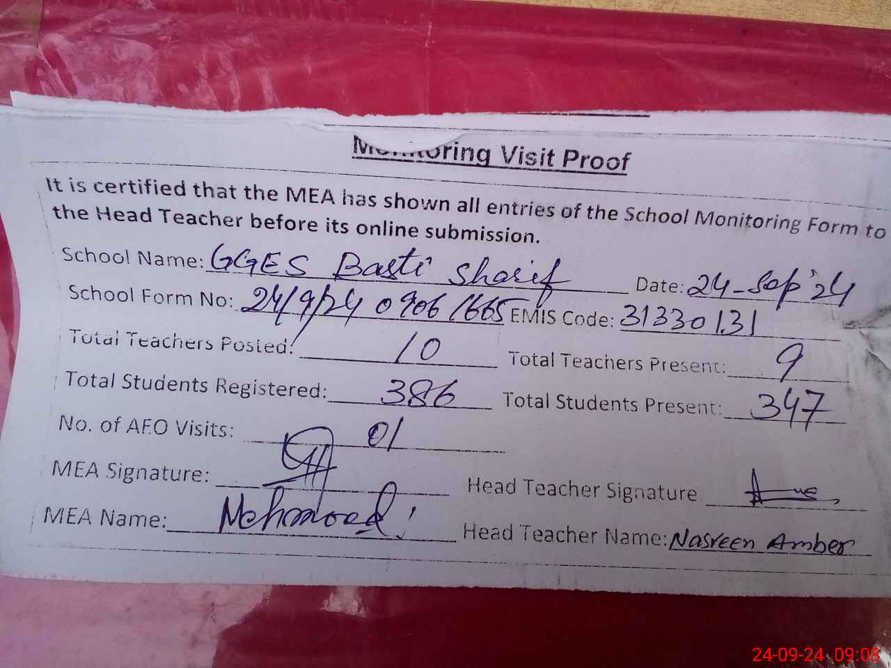 | Monitoring Date: 24-09-2024 | Start Time: 24-09-2024 08:35 AM | End Time: 24-09-2024 09:08 AM | Name of MEA: Ma**** UlHa**** | |