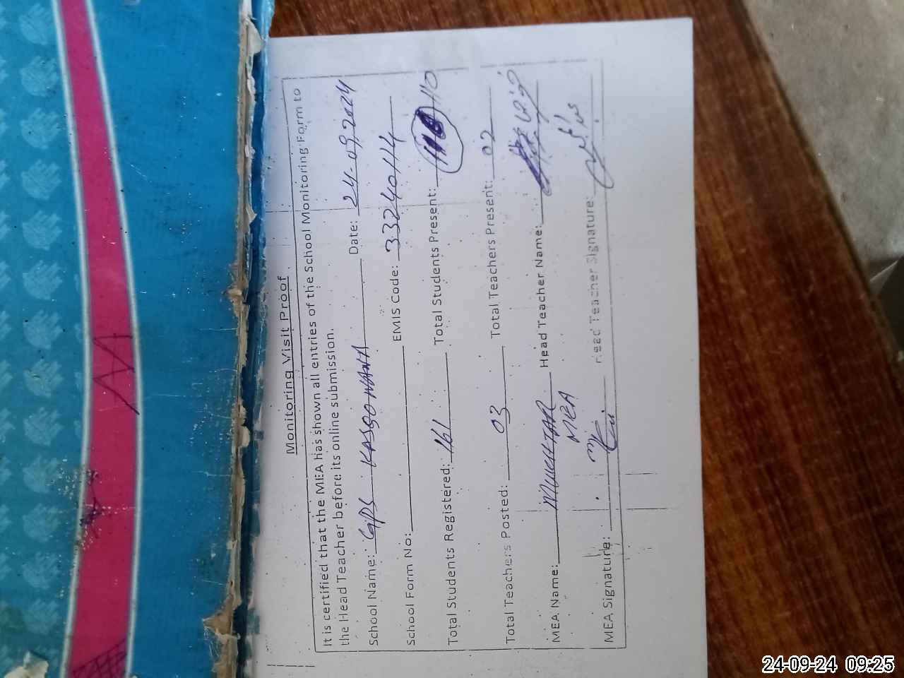 | Attendance Register | Head Teacher | MEA with School | Visit Proof |