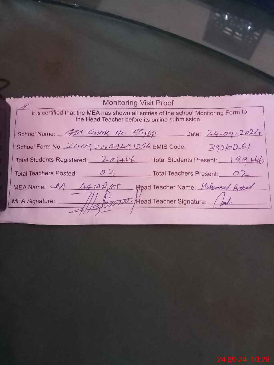 | Attendance Register | Head Teacher | MEA with School | Visit Proof |