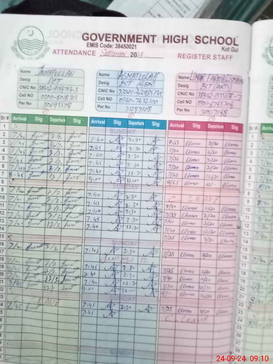 | CNIC | Full Name | Designation | R/C | Absence during last cal. month |