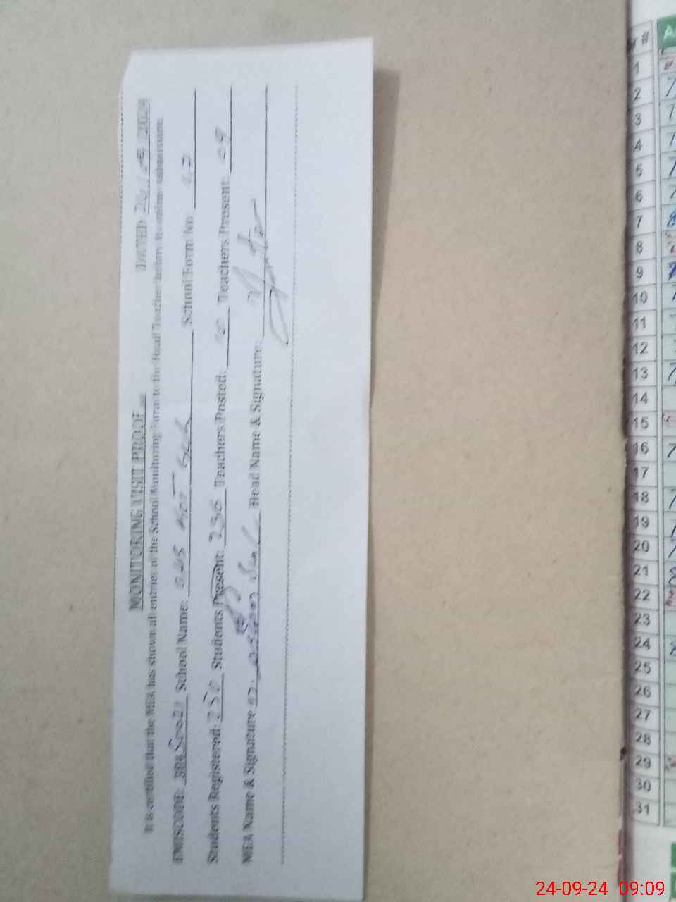 | Attendance Register | Head Teacher | MEA with School | Visit Proof |