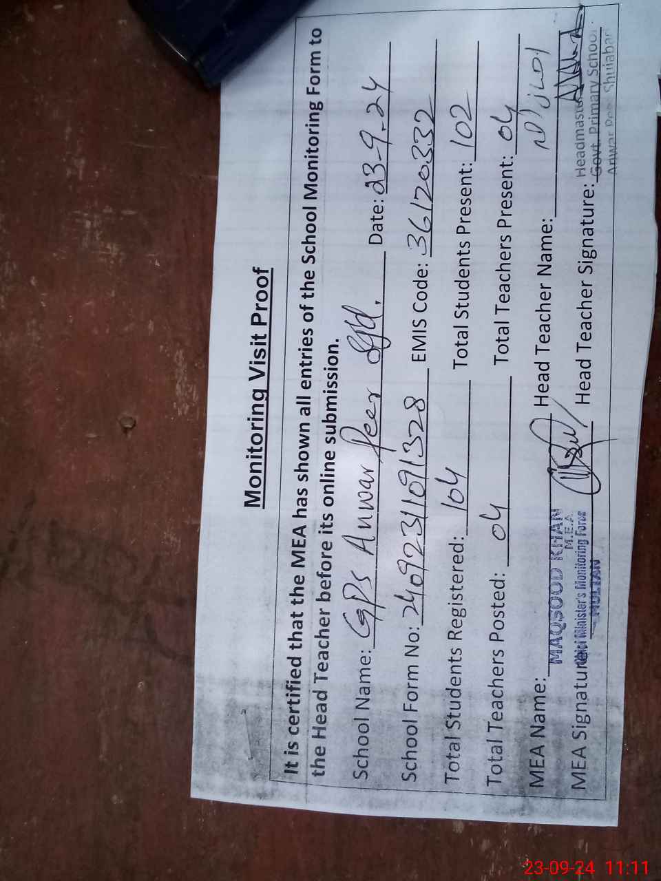 | Attendance Register | Head Teacher | MEA with School | Visit Proof |
