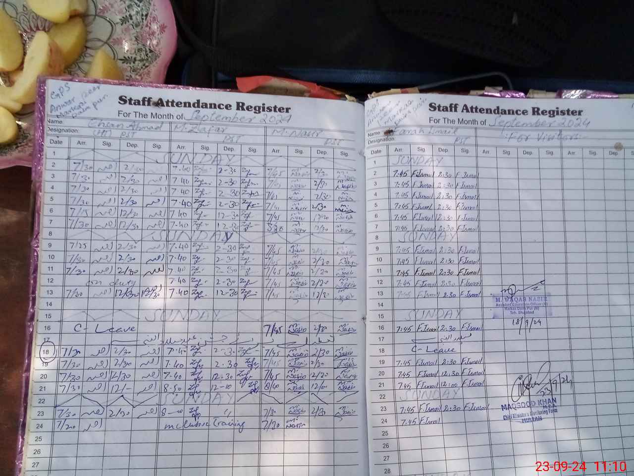 | Monitoring Date: 23-09-2024 | Start Time: 23-09-2024 10:45 AM | End Time: 23-09-2024 11:12 AM | Name of MEA: MA**** ULHA**** KH**** | |