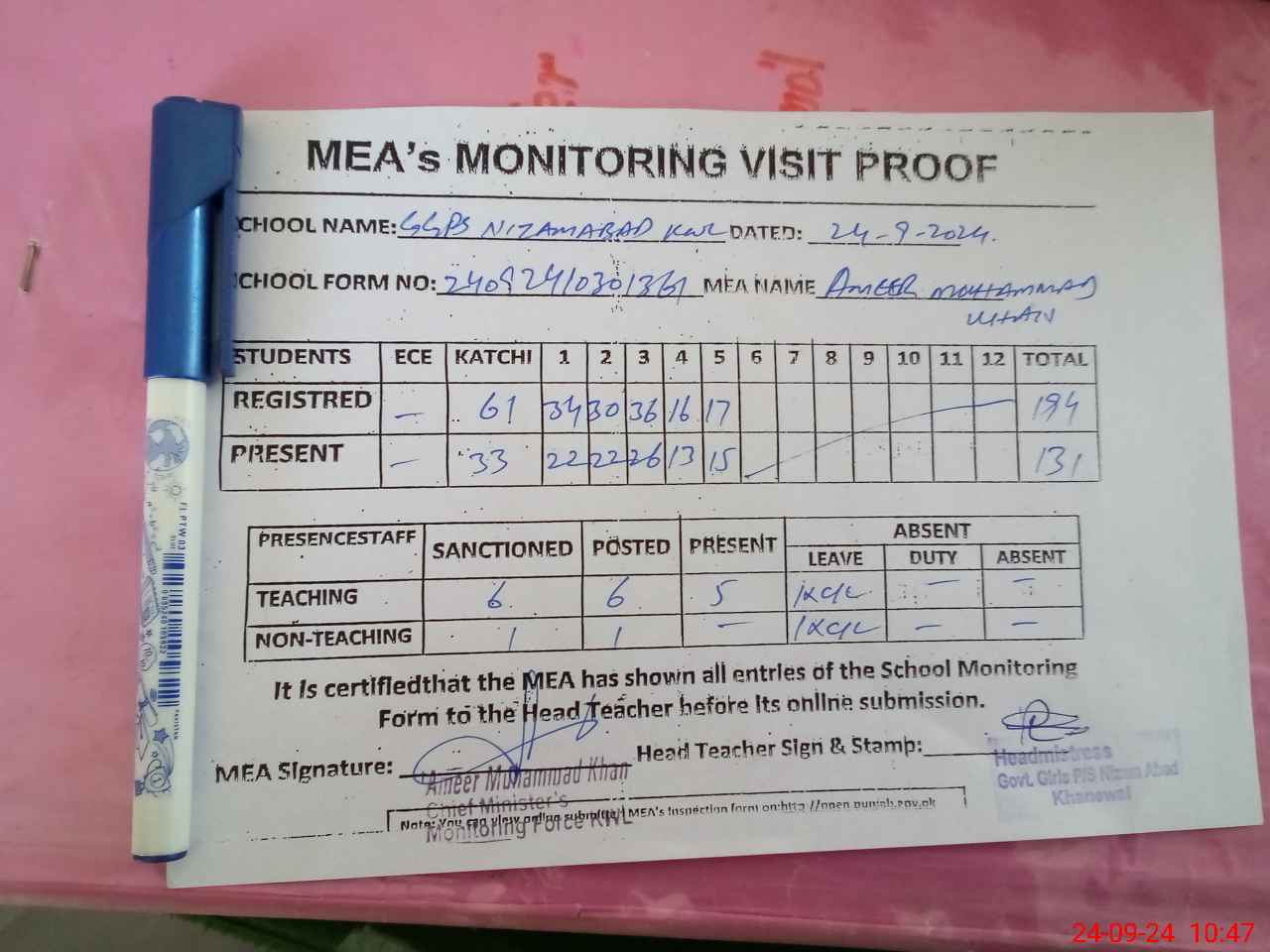 | Attendance Register | Head Teacher | MEA with School | Visit Proof |