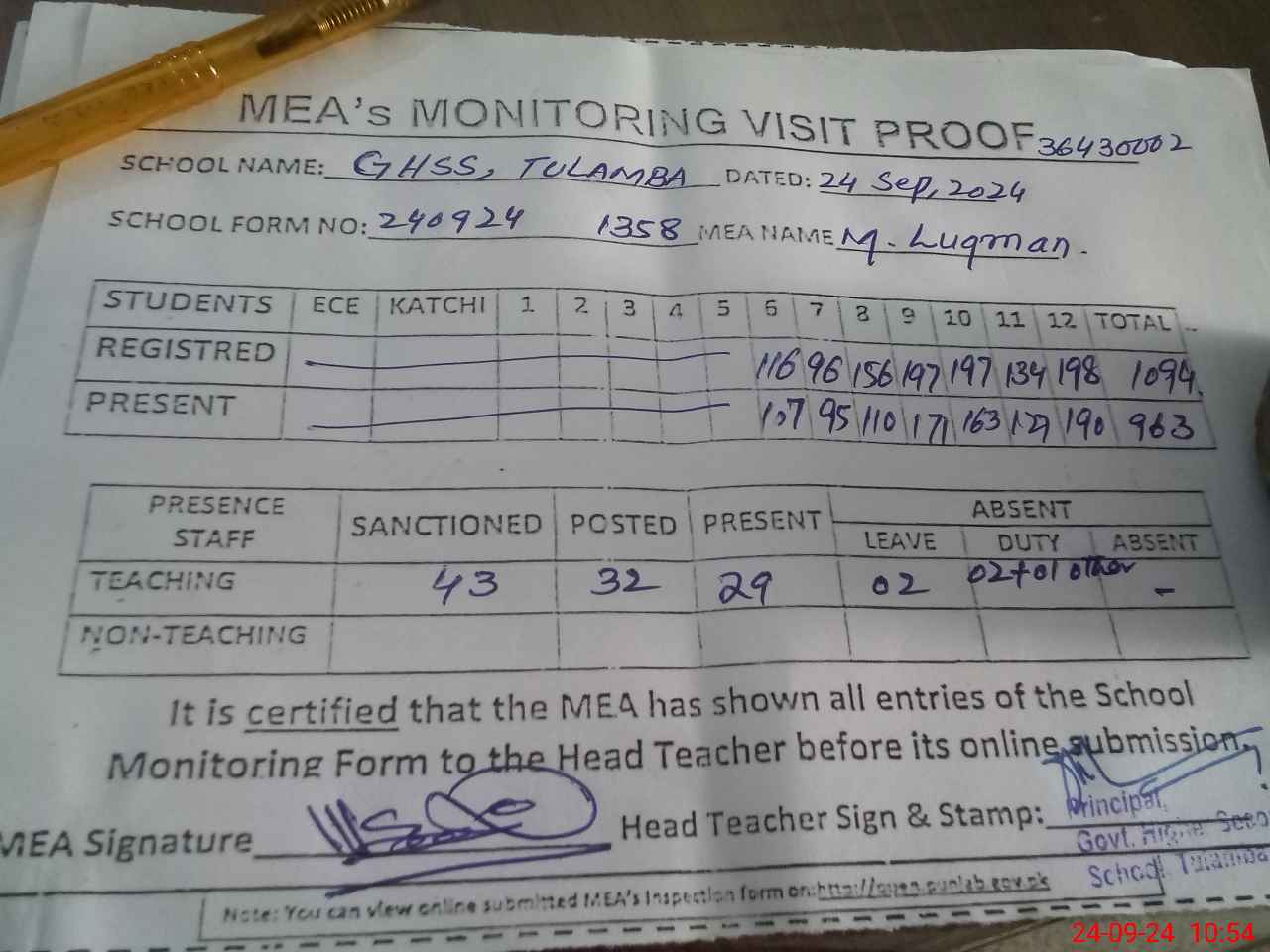 | Attendance Register | Head Teacher | MEA with School | Visit Proof |