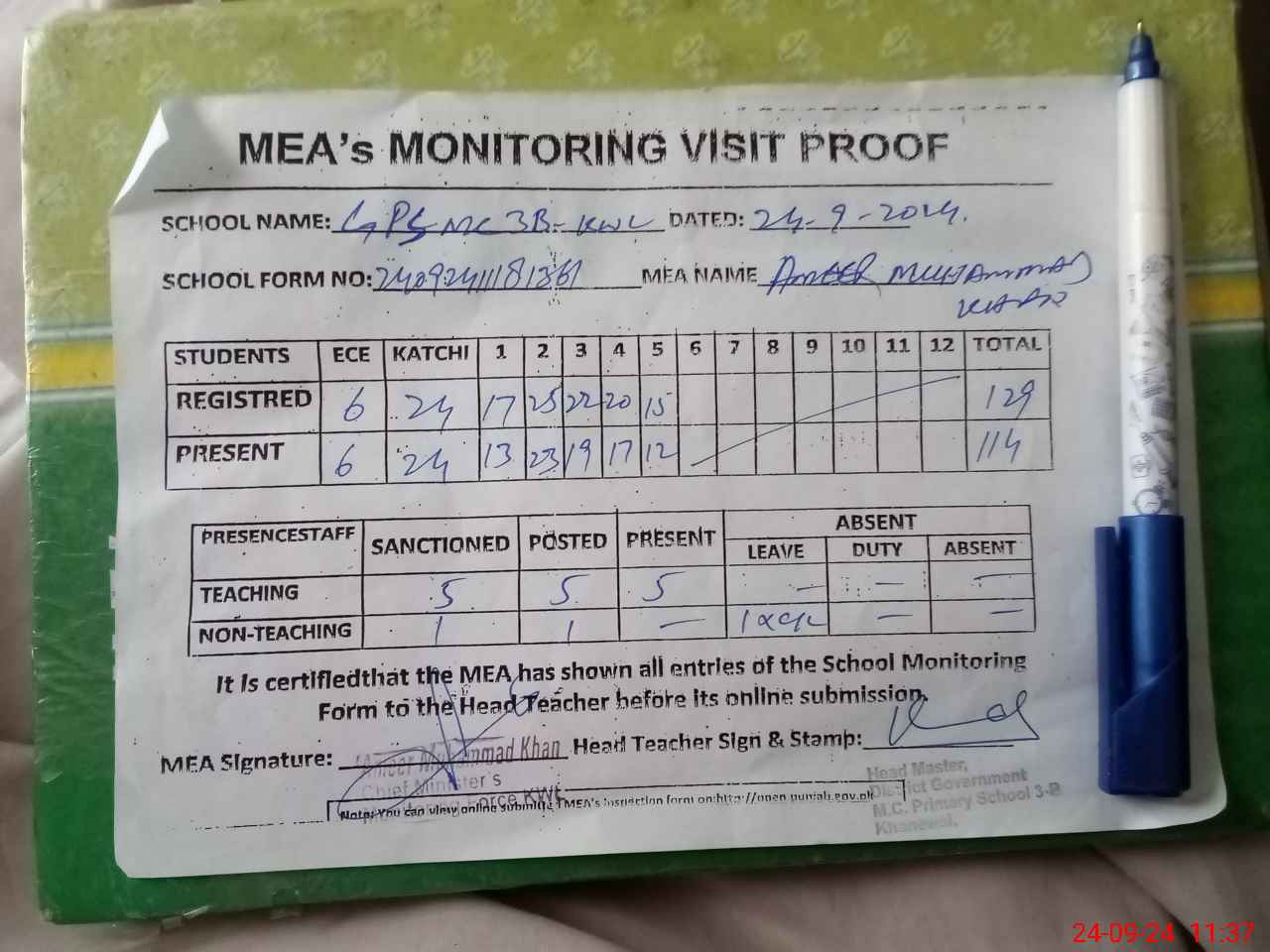 | Attendance Register | Head Teacher | MEA with School | Visit Proof |