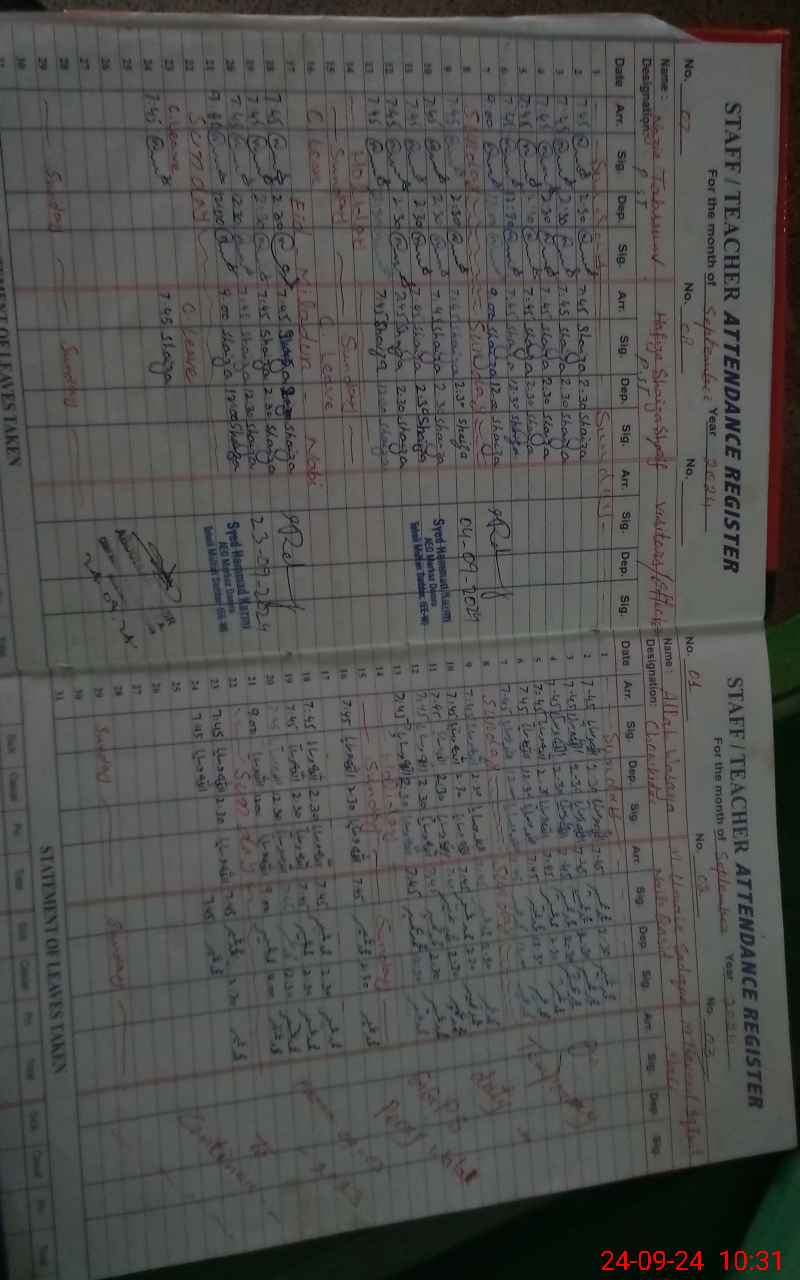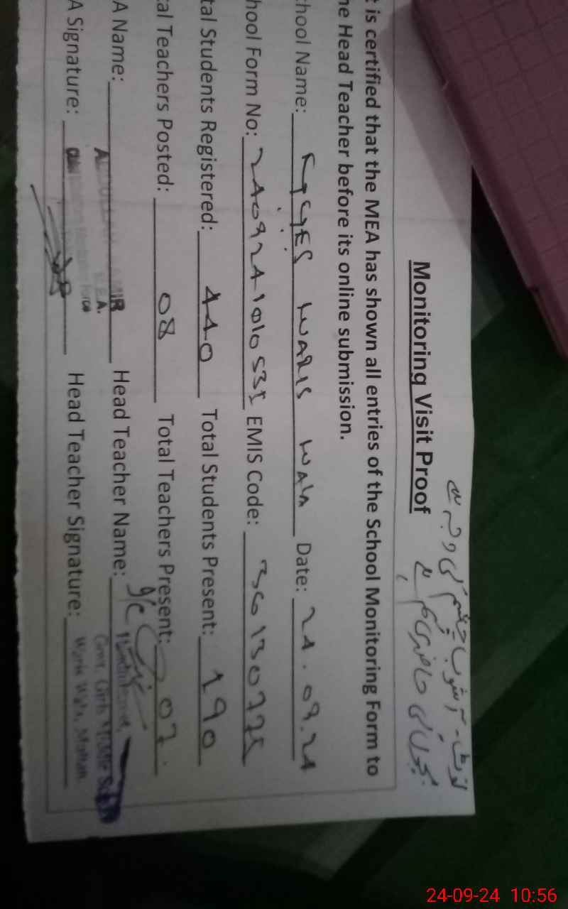 | Remarks (Use Separate Page if Required): Note MahJabeen Pst nic 3630202687296 join this School on 23 sep 24 Her data not on sis Sis data not up date of students Nsb not provided and not maintained Last clander month only one visit of Aeo p | |||||